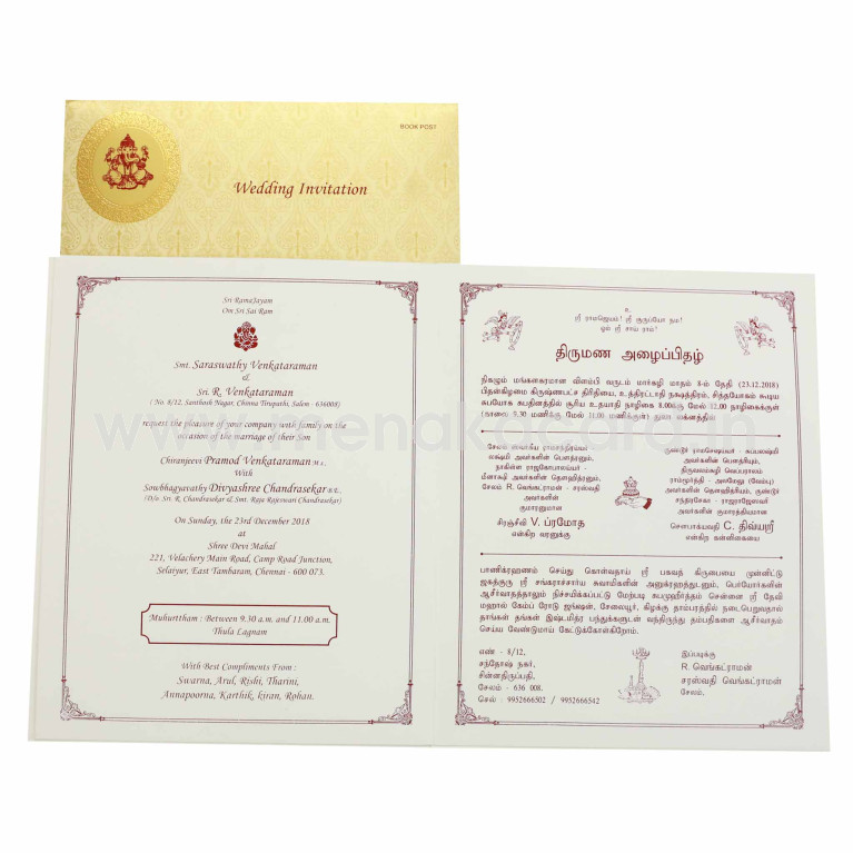 In wedding invitations, normally script fonts are used. We can prepare the text proof in suitable fonts based on your choice and forward to you for approval. The corrections may be forwarded, till your satisfaction. We can print cards in all languages like English, Tamil, Hindi, Gujarati, Kannada, Telugu, Malayalam, German, French and etc. In case of you are so particular in font, which is not listed on the page, you can always tell us the name of the font (A sent us the font file as an attachment with email), but it should suit for printing (ie) good quality printing.