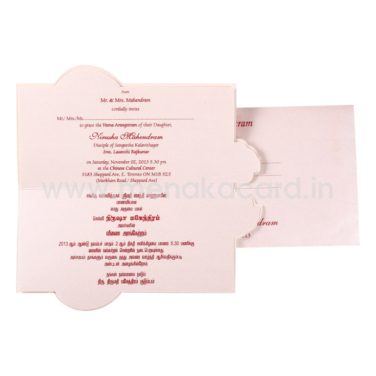 In wedding invitations, normally script fonts are used. We can prepare the text proof in suitable fonts based on your choice and forward to you for approval. The corrections may be forwarded, till your satisfaction. We can print cards in all languages like English, Tamil, Hindi, Gujarati, Kannada, Telugu, Malayalam, German, French and etc. In case of you are so particular in font, which is not listed on the page, you can always tell us the name of the font (A sent us the font file as an attachment with email), but it should suit for printing (ie) good quality printing.